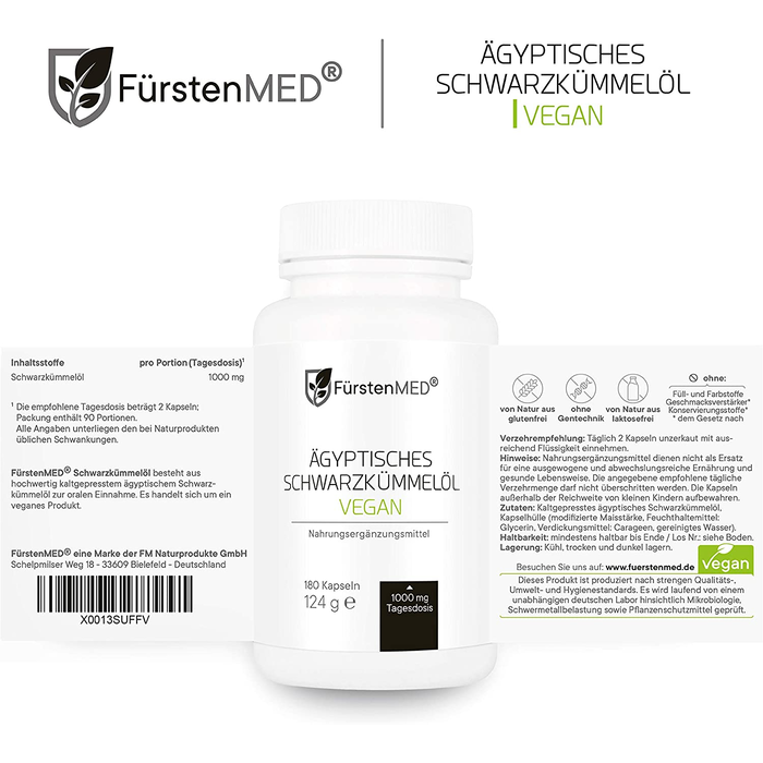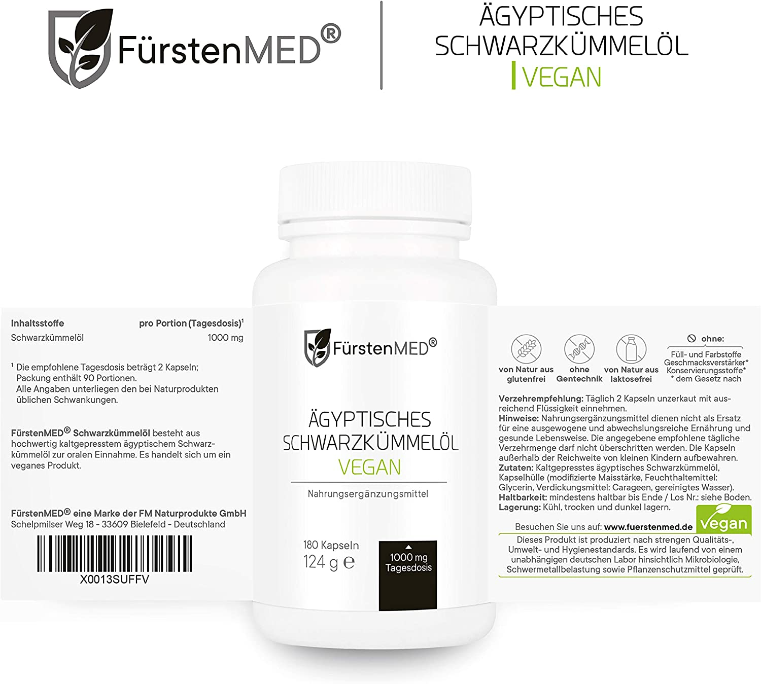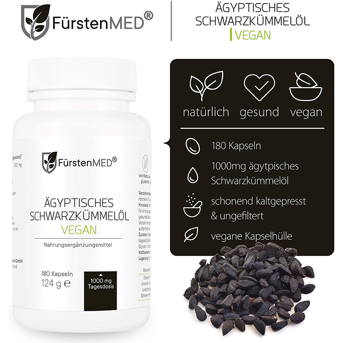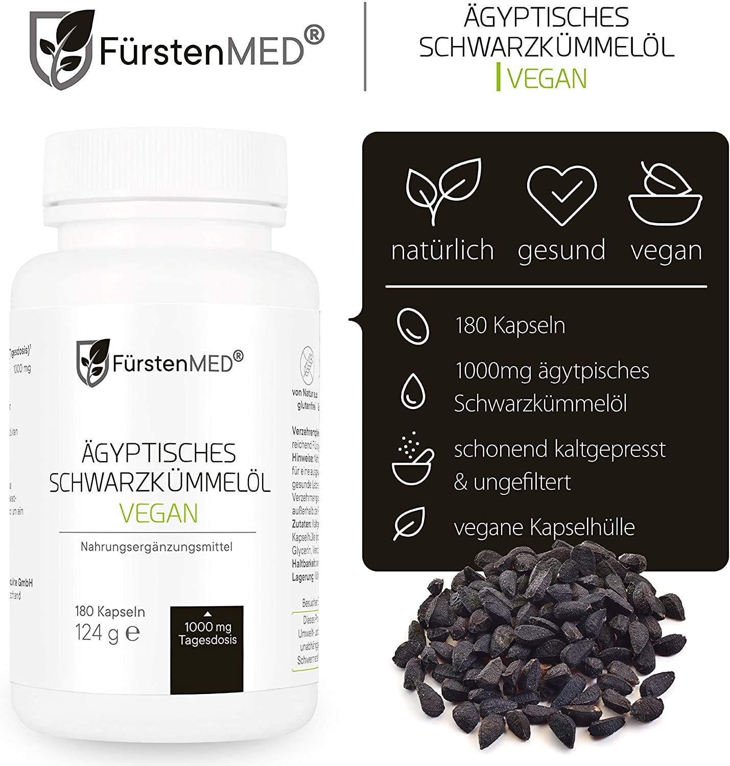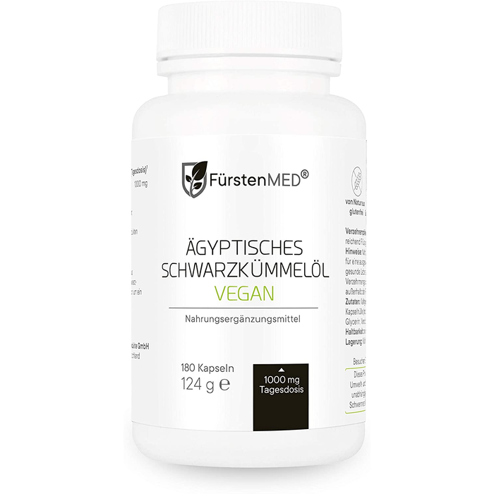 - Premium quality: high-dose capsules with cold-pressed Egyptian black cumin oil, the production of the capsules takes place exclusively in Germany, 180 vegan soft gel capsules each with 500 mg black cumin oil (1000 mg daily dose)