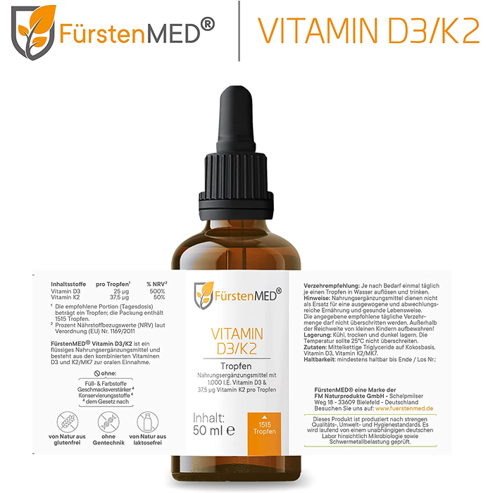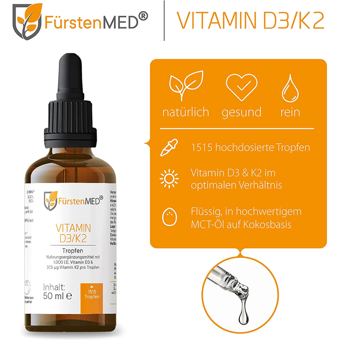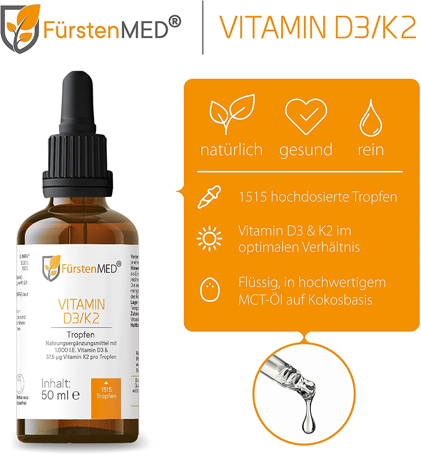 - High dose and natural: 1000 IU vitamin D3 and 37.5 μg vitamin K2 per drop (!) The vitamin D and K drops offer the highest bioavailability and best quality in an ideal combination - easy to use and dosage thanks to drip pipette