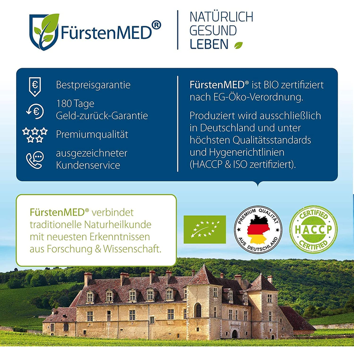 - The best for your health: German production (made in Germany) under the highest quality standards (ISO & GMP certified) as well as strict hygiene guidelines - FürstenMED stands for premium quality tested in independent laboratories and is organic certified according to EC Öko regulation
