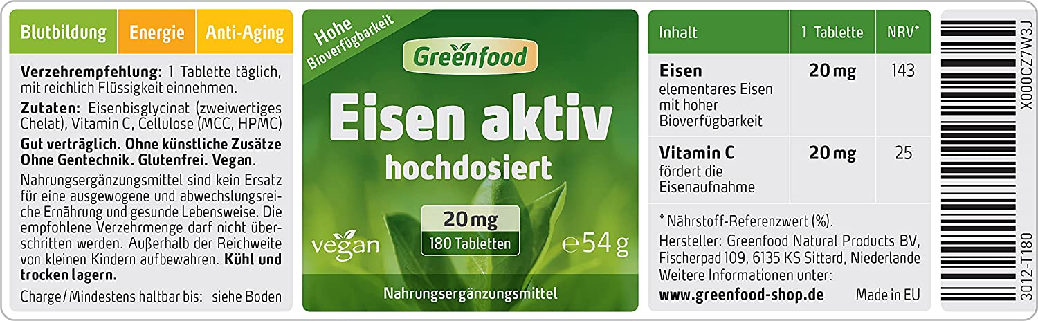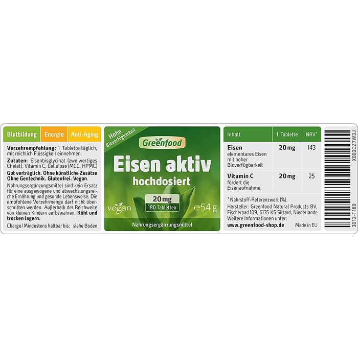 With Greenfood iron active, iron is present in the mould, in which it can be best recycled. As a high-quality chelate compound and accompanied by vitamin C. Vitamin C increases iron absorption and neutralises foods that inhibit iron absorption.