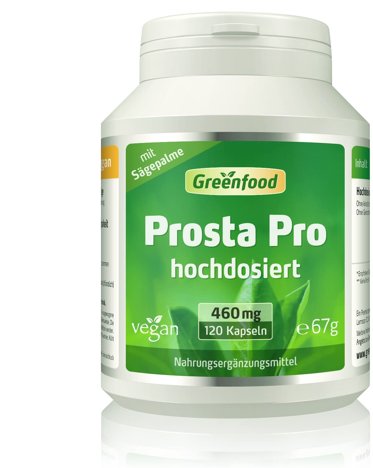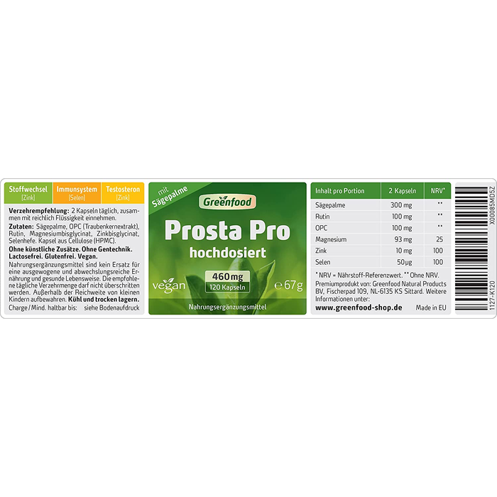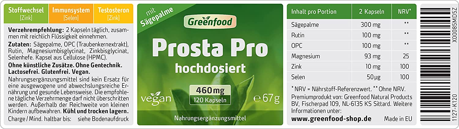Ingredients: Saw palm (extract), OPC (grape seed extract), rutin, magnesium bisglycinate, zinc bisglycinate, selenium yeast. Cellulose (HPMC) capsule.