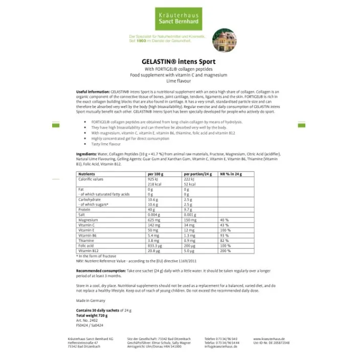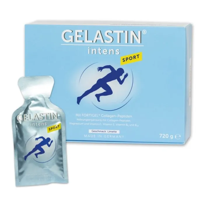 GELASTIN® intens Sport هو مكمل غذائي يحتوي على نسبة عالية جدًا من الكولاجين. الكولاجين هو أحد المكونات العضوية للنسيج الضام للعظام وغضاريف المفاصل والأوتار والأربطة والجلد. FORTIGEL® غني بالمكونات الأساسية للكولاجين والتي توجد أيضًا في الغضاريف. إنه يتمتع بحجم جزيئات صغير جدًا وموحد وبالتالي يمكن امتصاصه جيدًا بواسطة الجسم (التوافر البيولوجي العالي). إن ممارسة الرياضة بانتظام والاستهلاك اليومي لـ GELASTIN® intens Sport مفيدان لبعضهما البعض. تم تطوير GELASTIN® intens Sport خصيصًا للأشخاص الذين يمارسون الرياضة بنشاط.