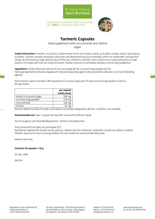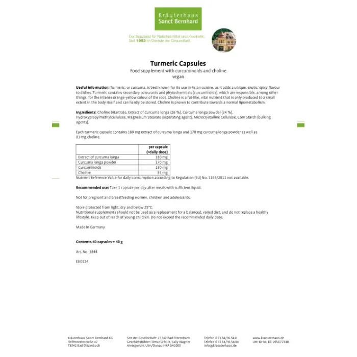 المكونات: بِتَرْتَرات الكولين، مستخلص الكركم لونجا (26%)، مسحوق الكركم لونجا (24%)، هيدروكسي بروبيل ميثيل سليلوز، ستيرات المغنيسيوم (عامل فصل)، سليلوز ميكروبلوري، نشا الذرة (عوامل تعبئة).