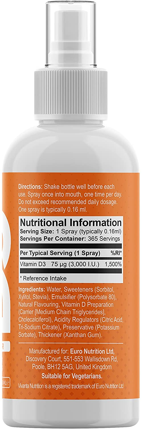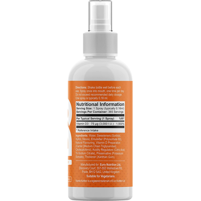 - Each one-spray dose provides 3,000 IU (75mcg) of Vitamin D3 which is 1,500% of the NRV (Nutrient Reference Value)