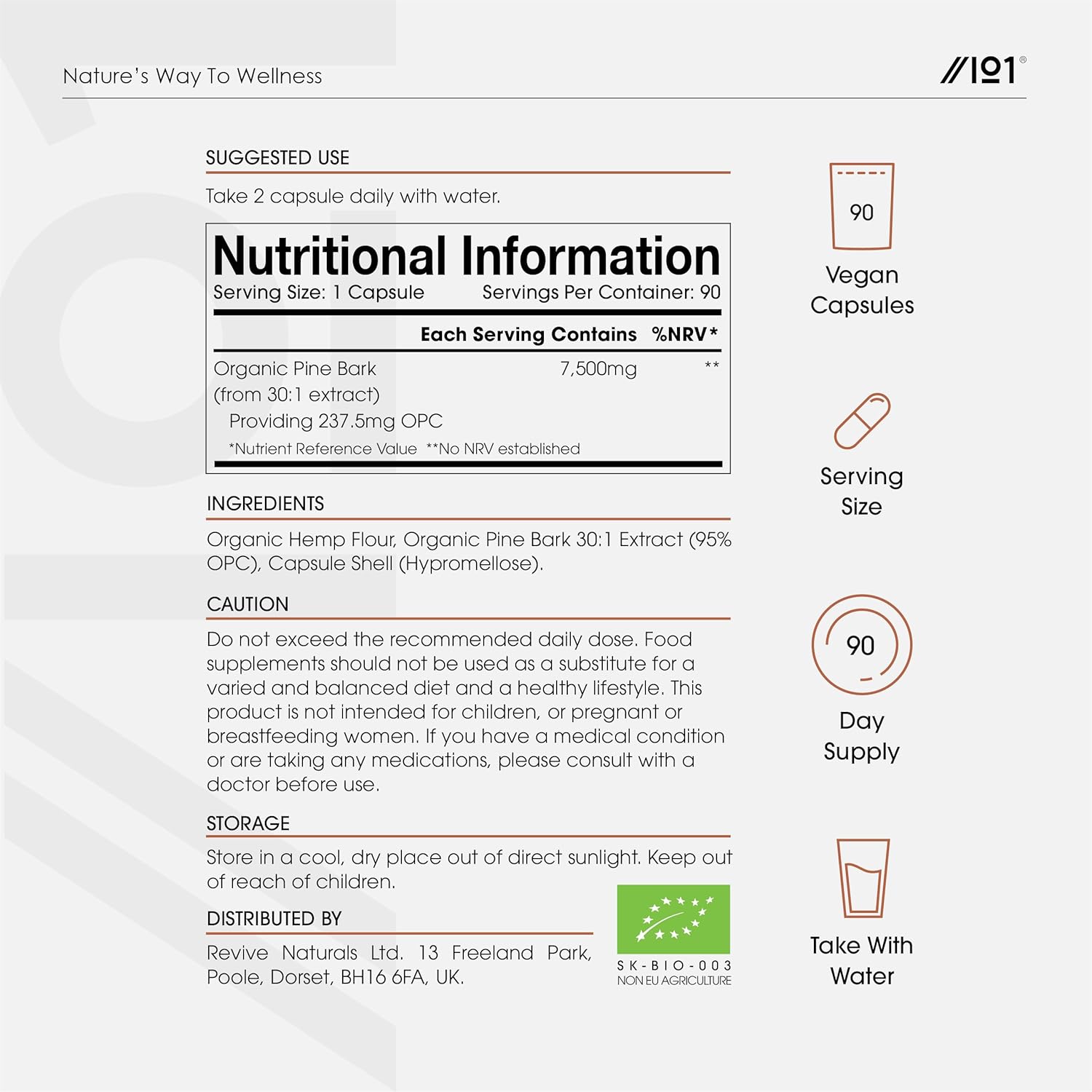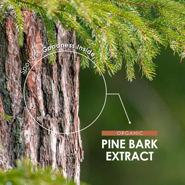 Sourced from maritime pine trees native to the Mediterranean region, Pine Bark Extract is a rich source of polyphenols, predominantly proanthocyanidins. Each capsule contains the botanical equivalent of 7500mg of Organic Pine Bark, providing 237.5mg of naturally-occurring oligomeric proanthocyanidins (OPC).