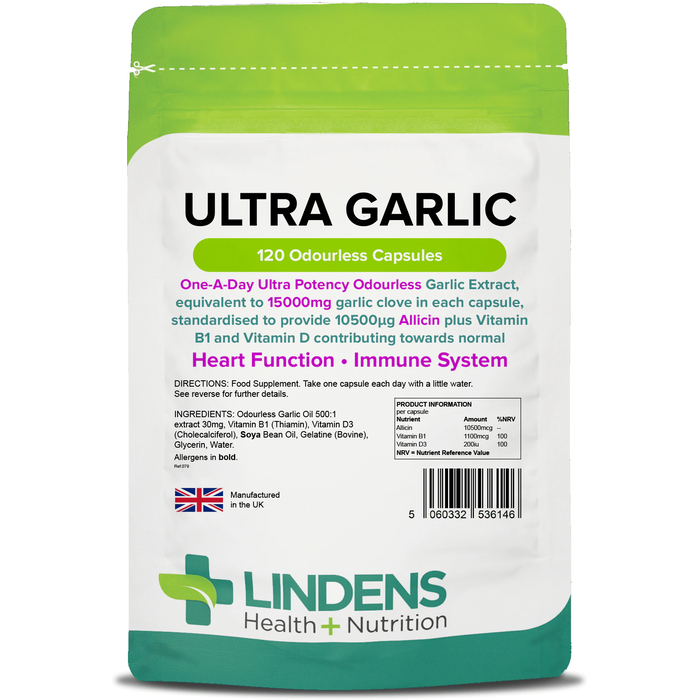 Lindens Ultra Garlic capsules are packed with 10500mcg allicin to support normal muscle function for healthy movement and digestion, as well as strong bones and teeth. These benefits are supported by the combination of Vitamin B1 and D3, which also help metabolism. These potent, odourless garlic supplement capsules contain 1155mg Vitamin B1 and 5mcg Vitamin D, which is 100% of an adult's daily Nutrient Reference Value. Lindens Health + Nutrition is leading the way in consumer nutrition supplements to give you tried and trusted quality with all our products! Our Ultra Garlic supplement is packaged in foil-fresh, resealable and light-proof pouches and manufactured right here in the UK!