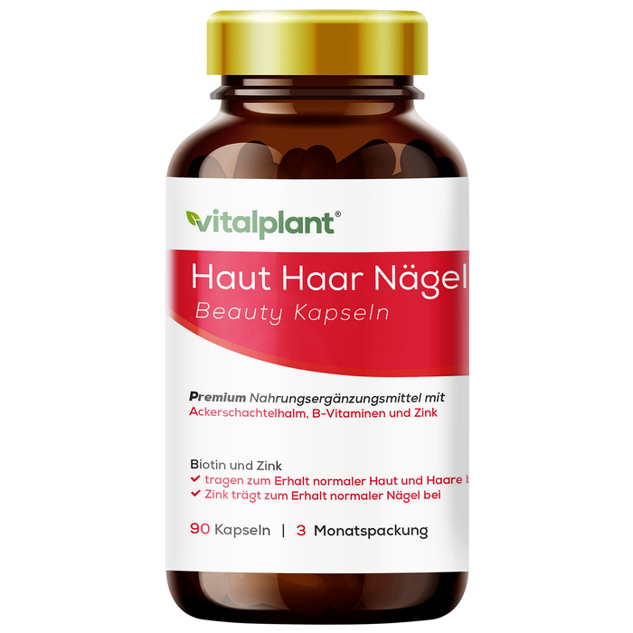 In particular, a lack of certain vitamins , minerals and trace elements can quickly lead to skin, hair and nails losing their radiant beauty. In the Vitalplant “skin, hair, nails” capsules , selected vitamins from the B group , such as biotin, help to maintain normal skin and hair. And all of this can be conveniently dosed.