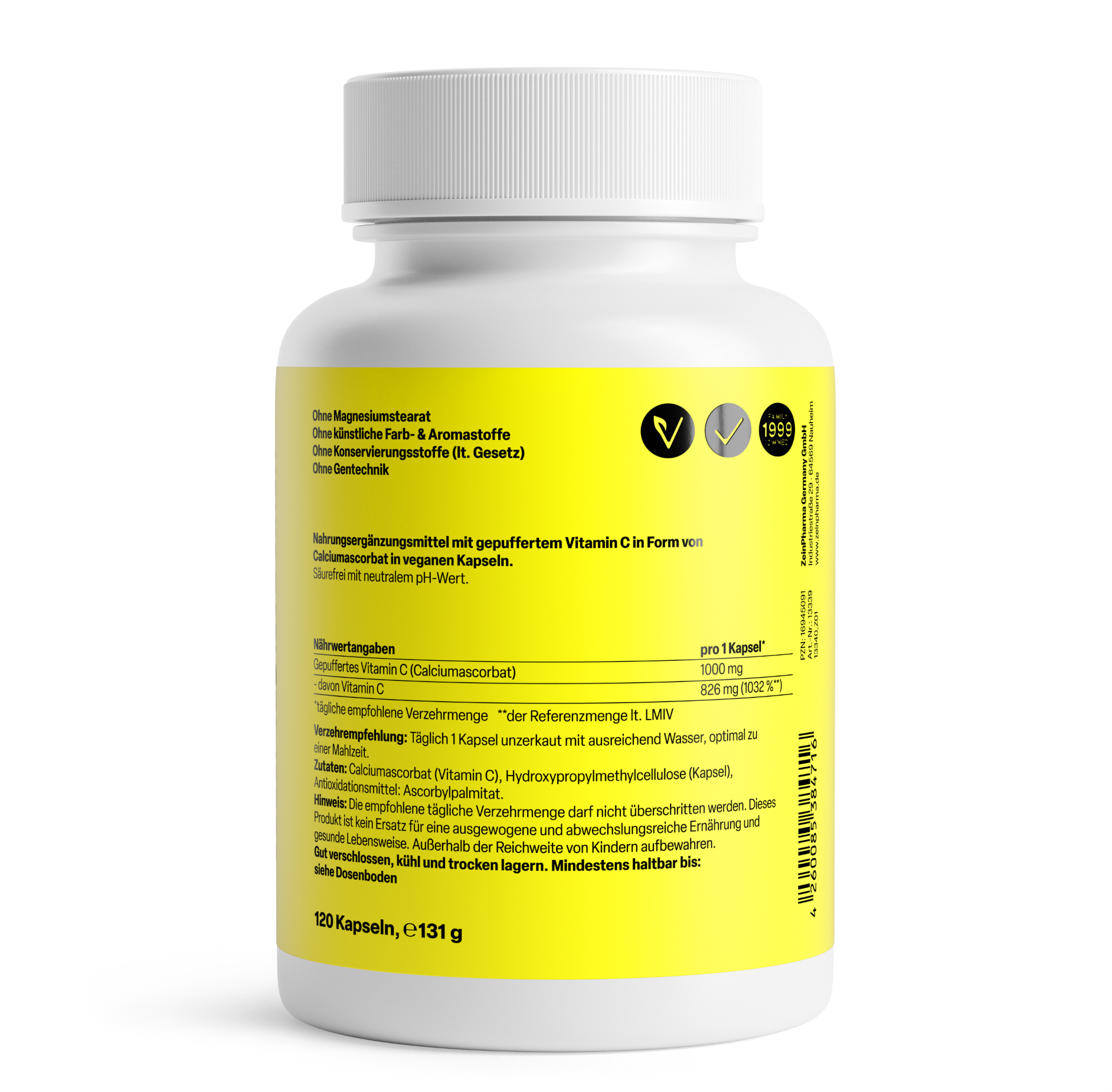 - 1000 mg bioaktives Vitamin C in Form von Calciumascorbat pro Kapsel