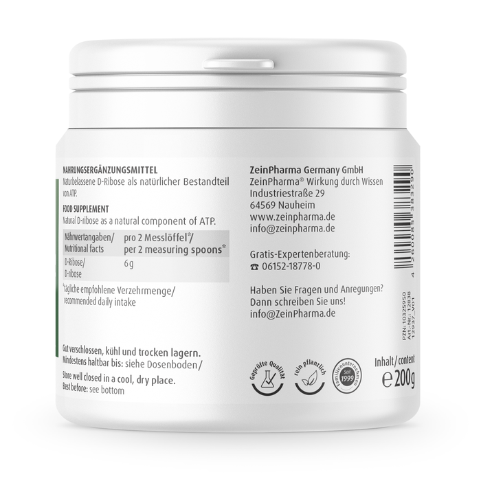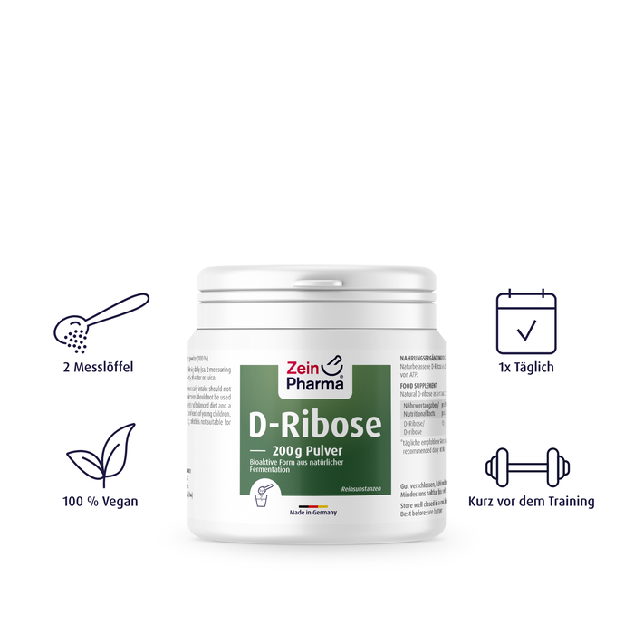 - Rein und natürlich: Das D-Ribose Pulver wird durch natürliche Fermentation von Glukose (aus Mais) gewonnen und ist absolut rein.