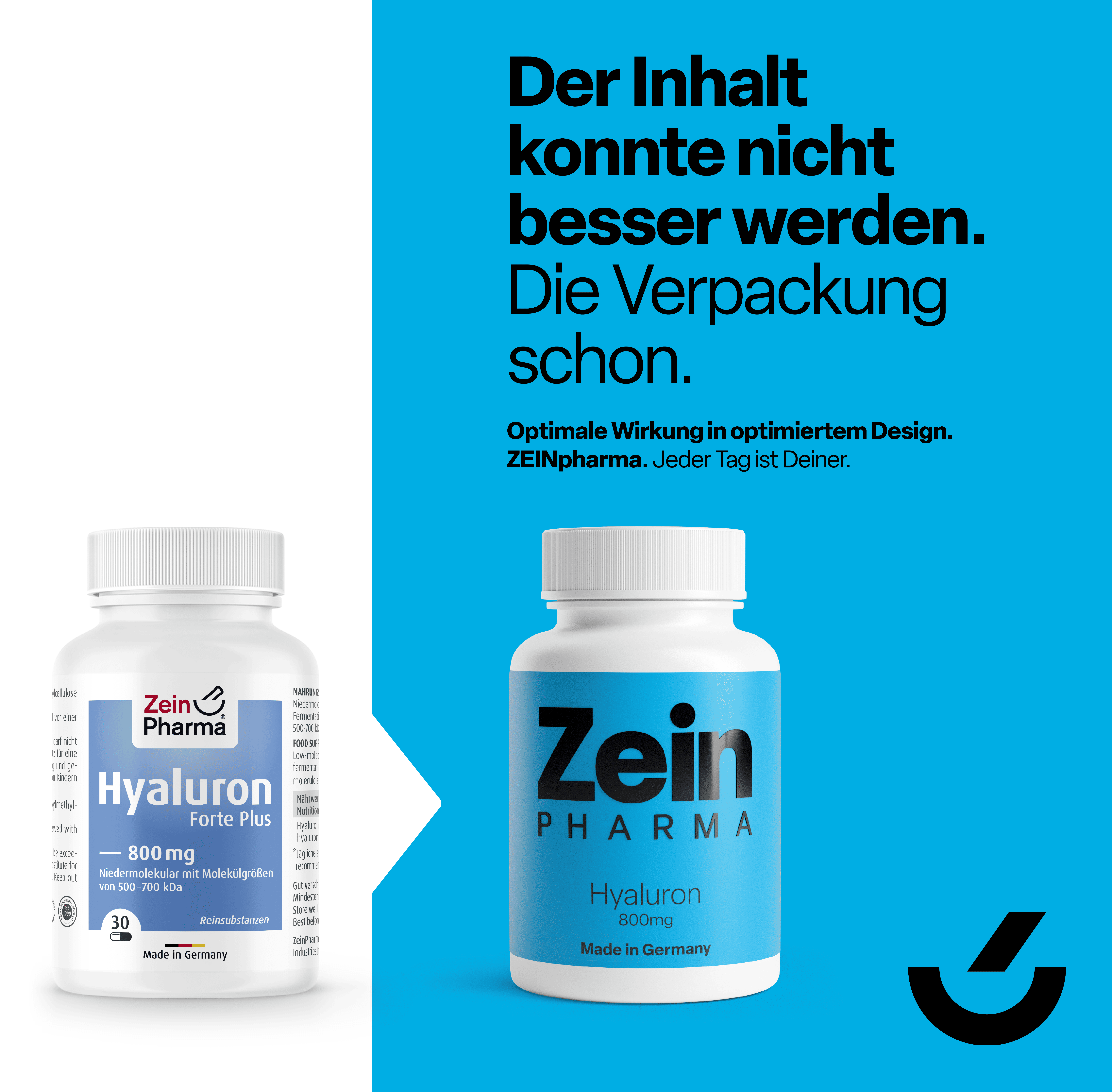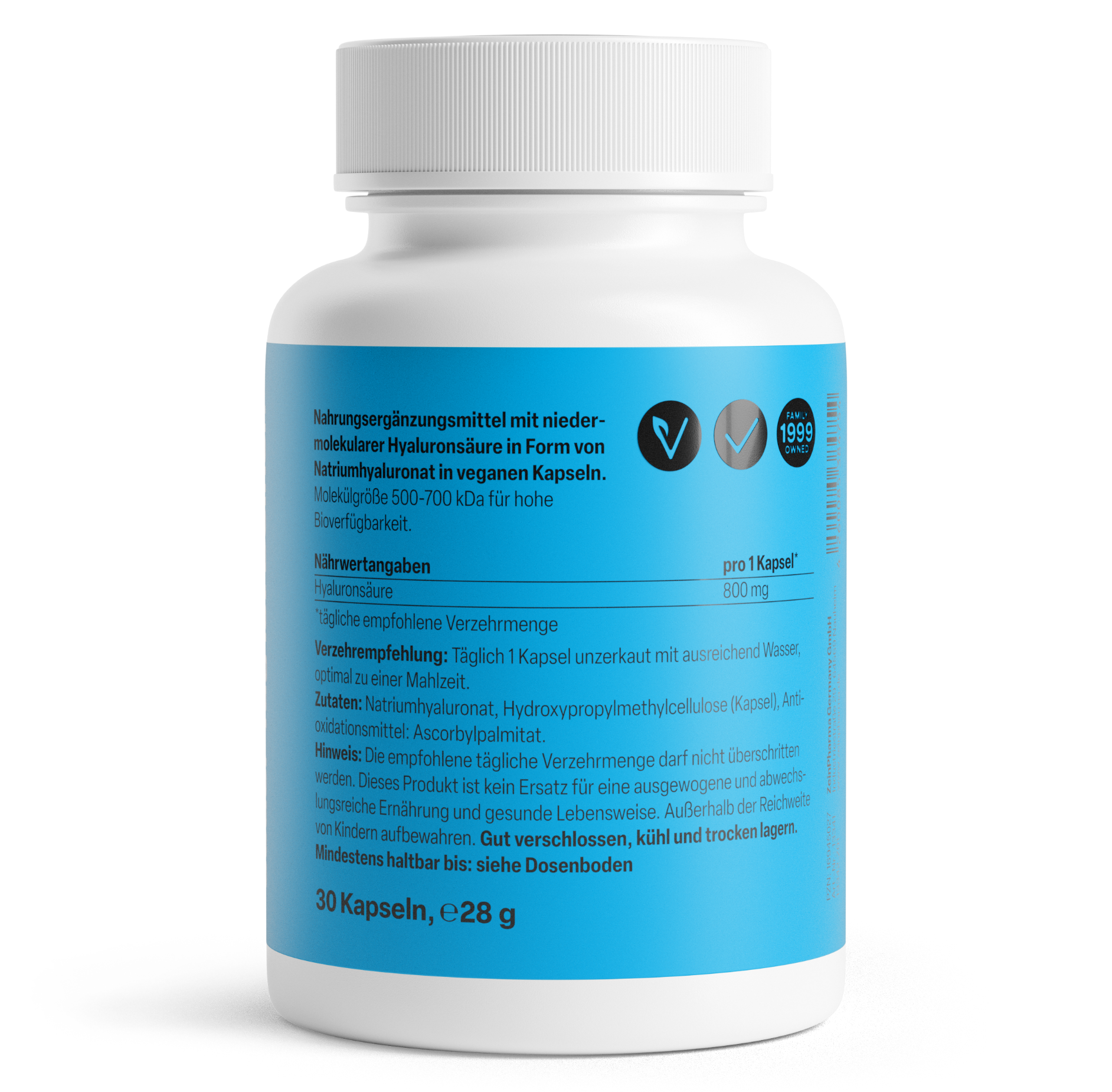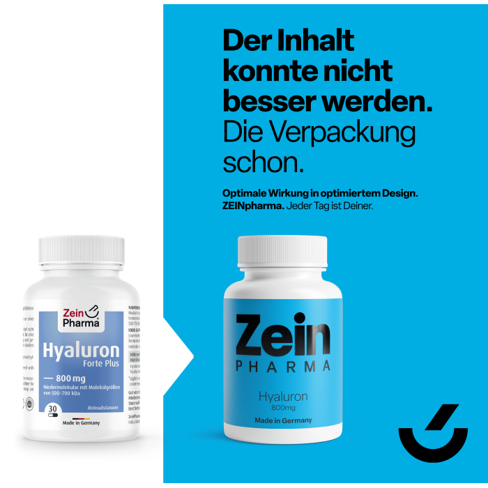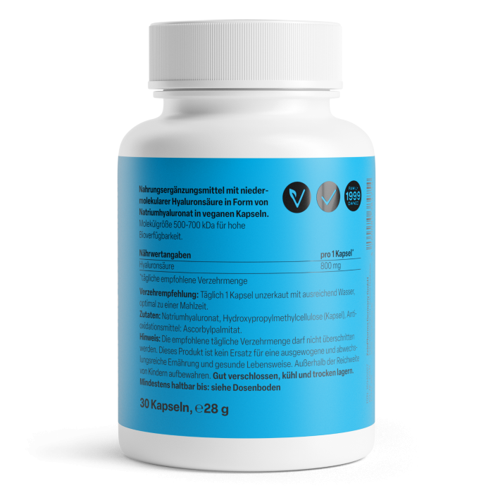 - 800 mg Hyaluronsäure pro Kapsel in Form von hochwertigem Natriumhyaluronat, einer besonders gut bioverfügbaren Variante.