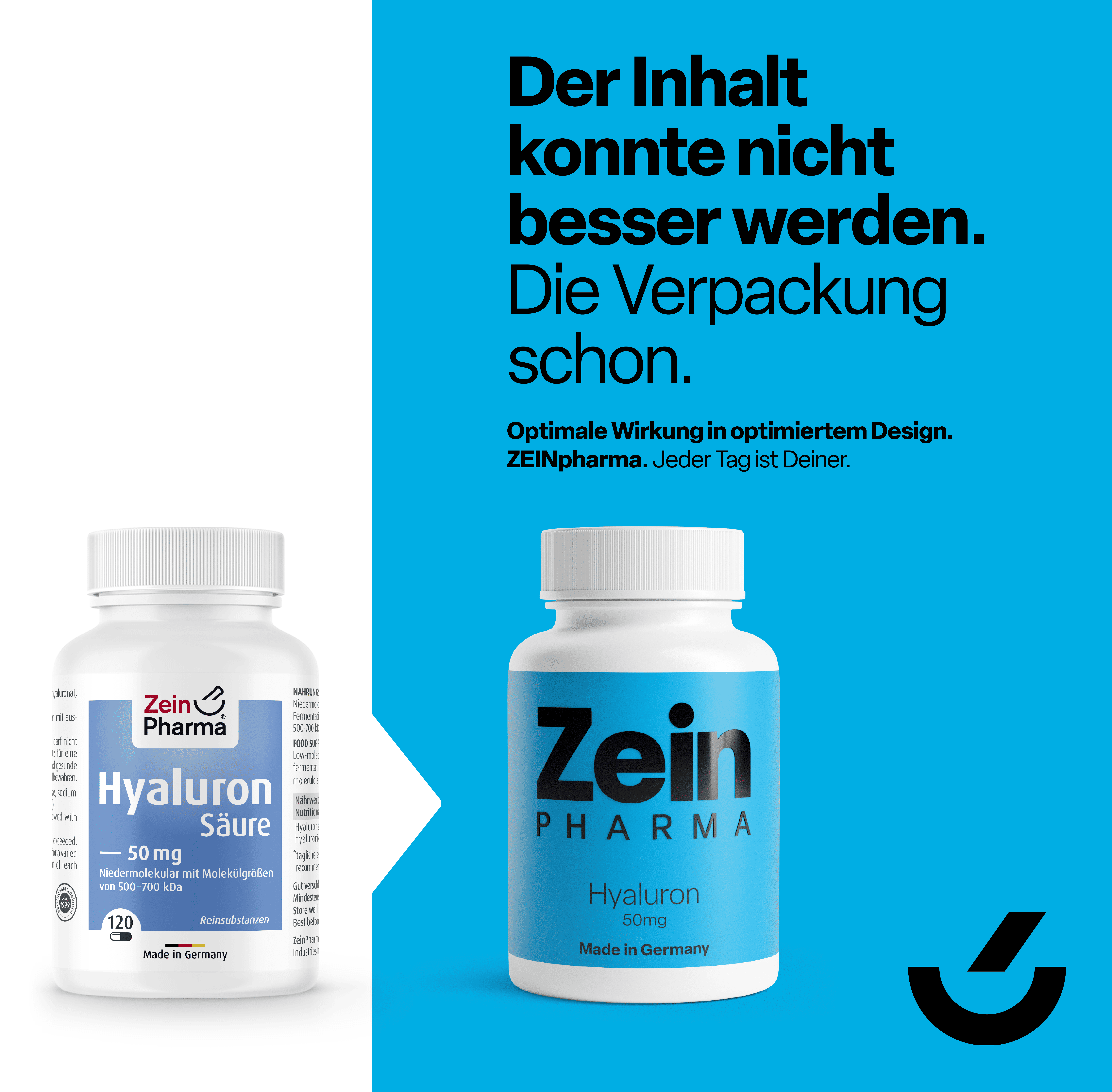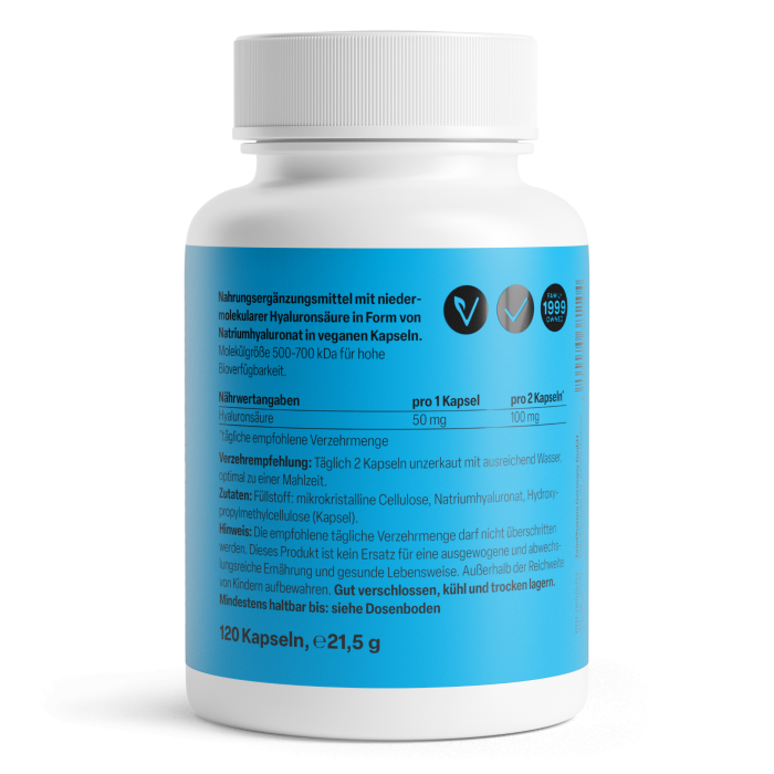 - Niedrig dosiert: 50 mg Hyaluronsäure pro Kapsel.