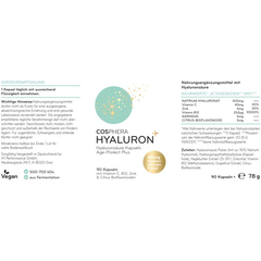 THANKS TO THE HIGHEST DOSAGE - The Cosphera hyaluronic acid capsules contain 500 mg micro-molecular hyaluronic acid (especially low-molecular premium hyaluronic acid) per capsule. 90 easy-to-swallow capsules provide the body with high-dose ingredients for 3 months. STRONG...