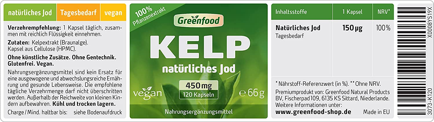 Our body needs iodine to form the thyroid hormones and ensure the function of the thyroid gland. The hormones of this small body organs are often underestimated, but they play an important role in almost all metabolic processes in the body. Iodine is particularly important for the normal development of unborn and newborns during pregnancy and breastfeeding. It is also used for optimal brain performance (thinking, concentration, memory) and energy metabolism. Iodine must be regularly absorbed through the food because the body cannot form it itself. The brown algae Kelp is a very rich source of iodine that is suitable for anyone who likes to ensure their iodine supply naturally instead of chemicals. Kelp from Greenfood contains numerous other vital substances in addition to a very high iodine content. Many minerals, trace elements and vitamins. These include calcium, sodium, magnesium, phosphorus, iron, sulphur, copper, zinc, potassium and manganese as well as vitamins A, B1, B3, B5, B6, B9, B12, C and E. Thanks to this natural nutrient combination, kelp is absorbed very well and is very tolerated.