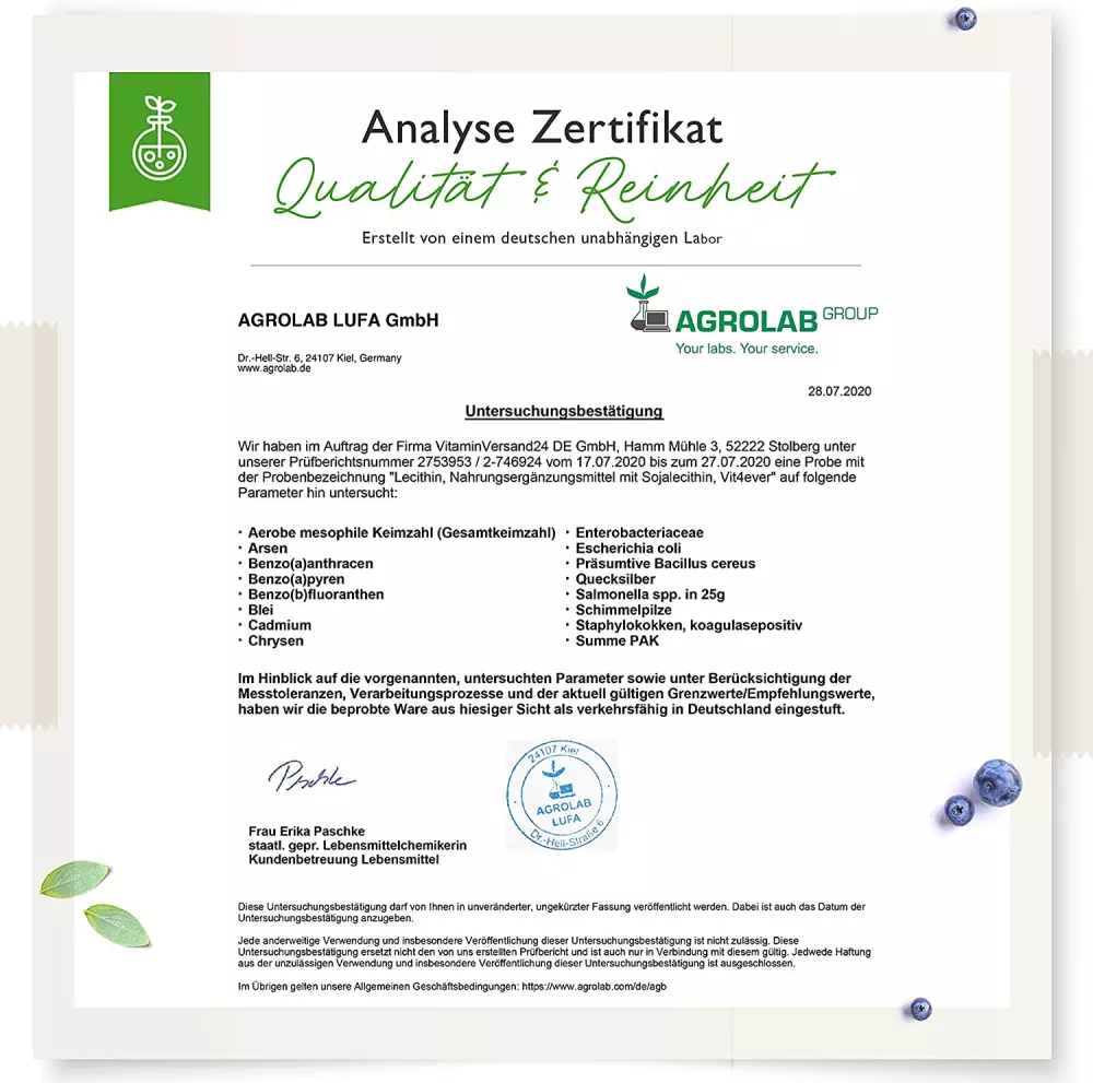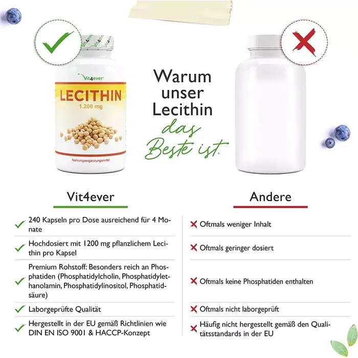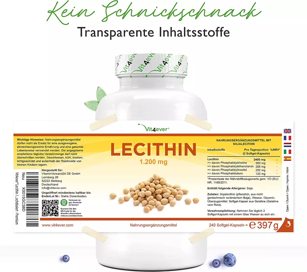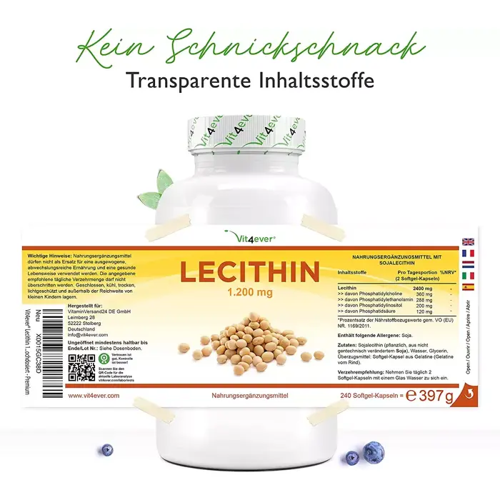Lecithin (German: 'egg yolk') is a substance that our body produces itself, but which is also absorbed through food and nutritional supplements. Lecithin is the classic name for a group of chemical compounds called phosphatidylcholines. These are phospholipids that are made up of fatty acids, glycerin, phosphoric acid and the ammonium compound choline.