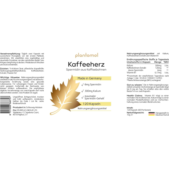 Minimum quantity for "Plantomol Kaffeeherz Spermidin aus Kaffeebohnen (Coffee Heart Spermidine From Caffeine Beans 120 Capsules)" is 1.