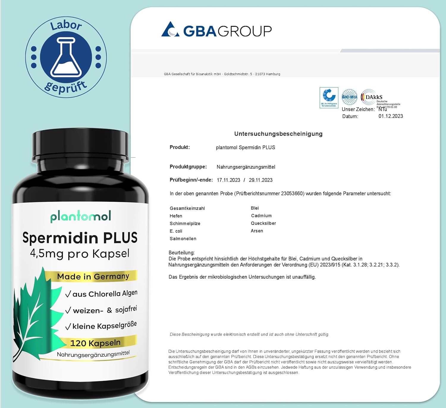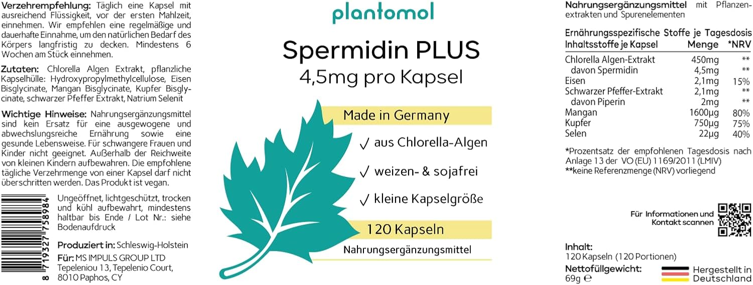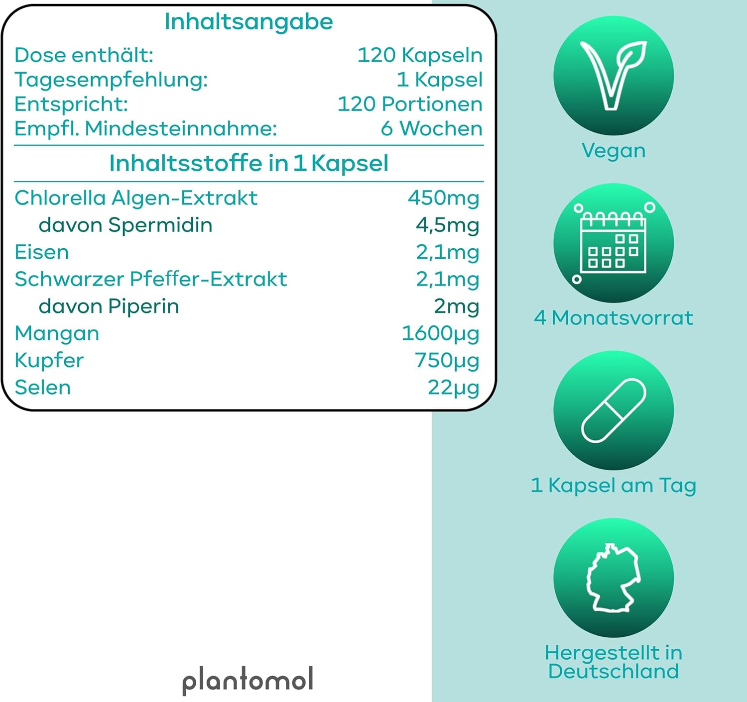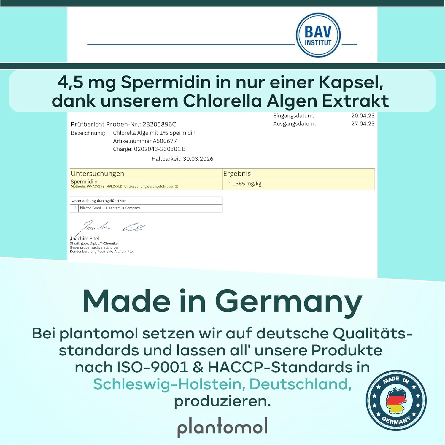 Spermidine is a natural substance also found in the human body and, according to studies, plays an important role in supporting autophagy. The Spermidine Plus Complex provides 4.5 mg of spermidine per daily dose from high-quality chlorella algae extract. We deliberately avoid wheat germ extracts and use algae to offer a sustainable and pure formula.