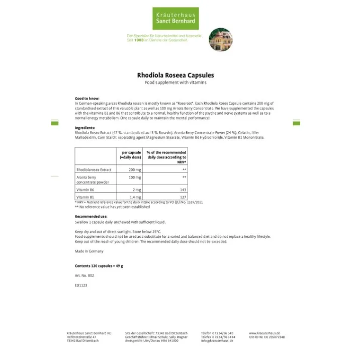 | Other Ingredients | Rhodiola Rosea Extract (47 %, standardized auf 3 % Rosavin), Aronia Berry Concentrate Power (24 %), Gelatin, filler Maltodextrin, Corn Starch; separating agent Magnesium Stearate, Vitamin B6 Hydrochloride, Vitamin B1 Mononitrate. | — |