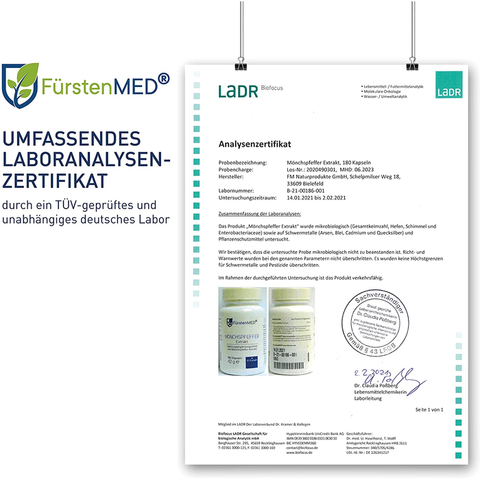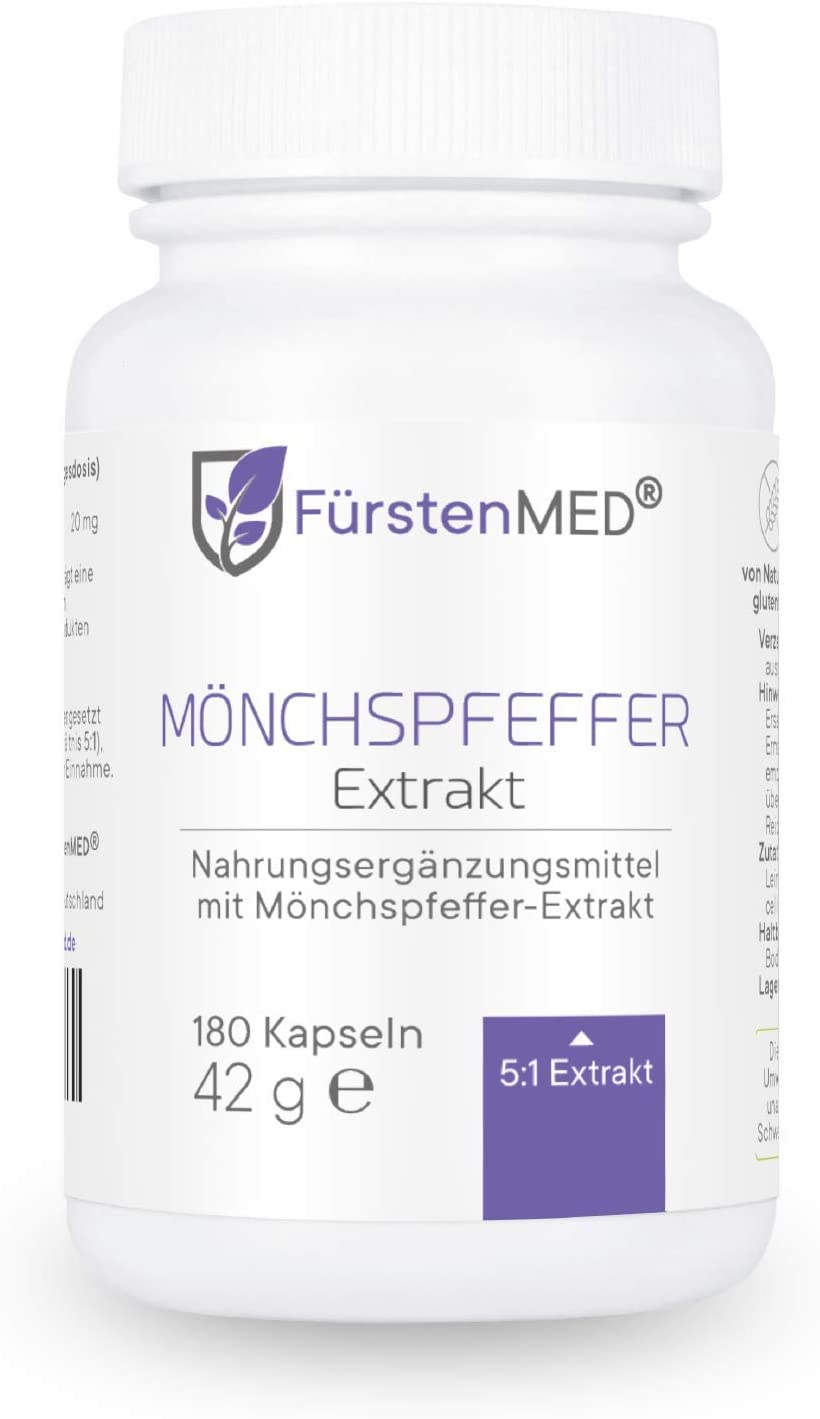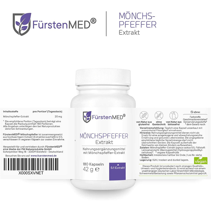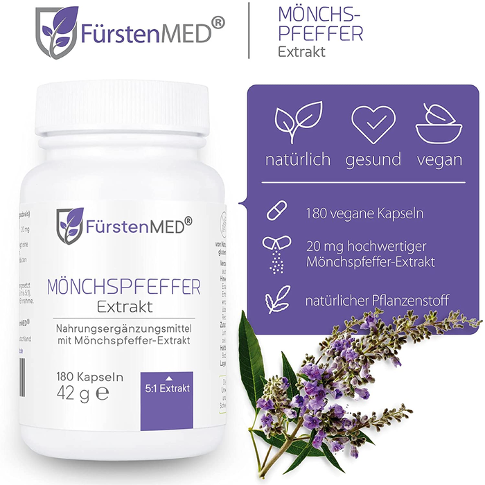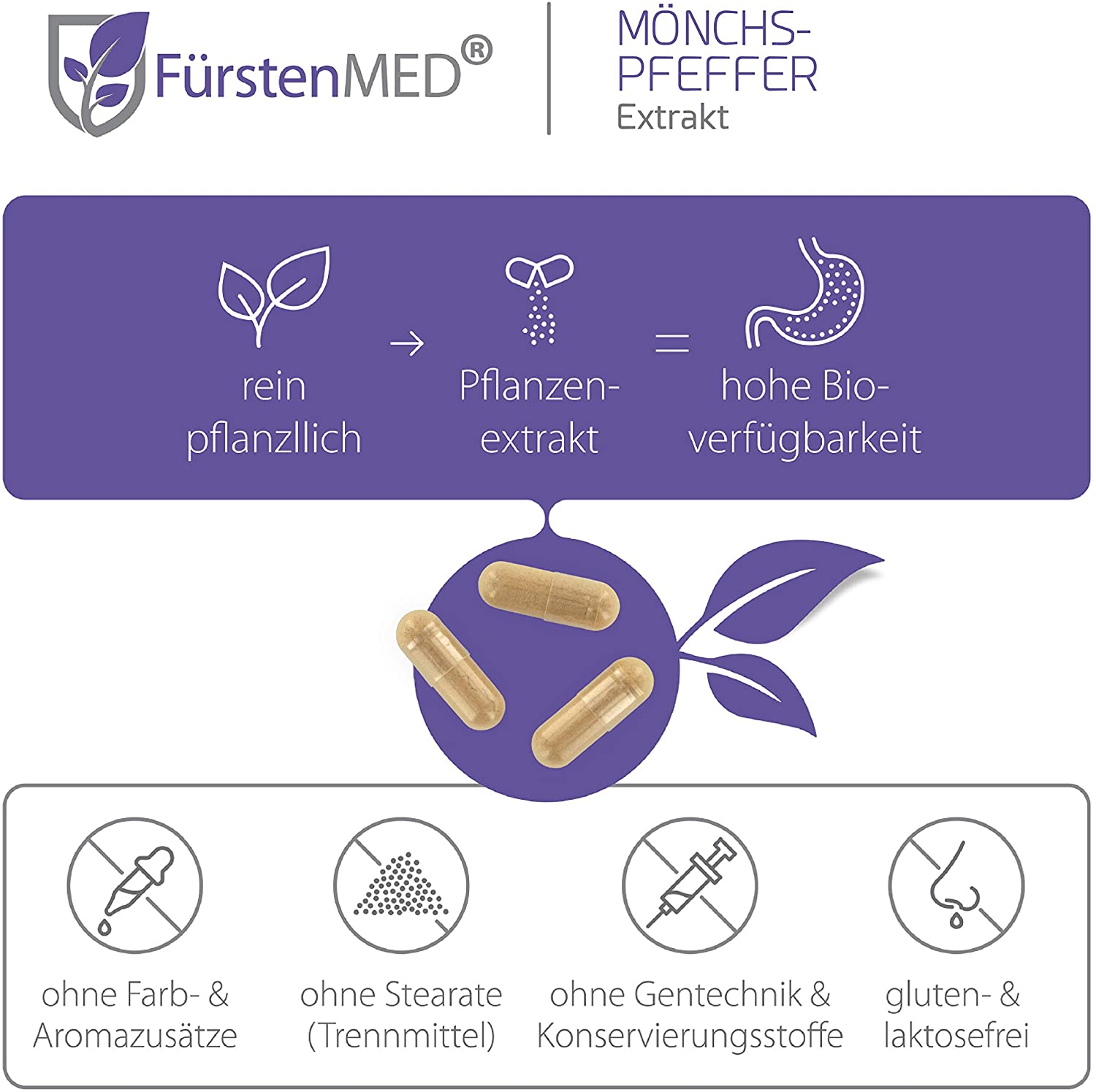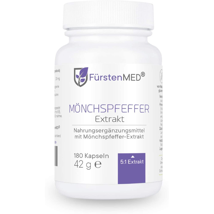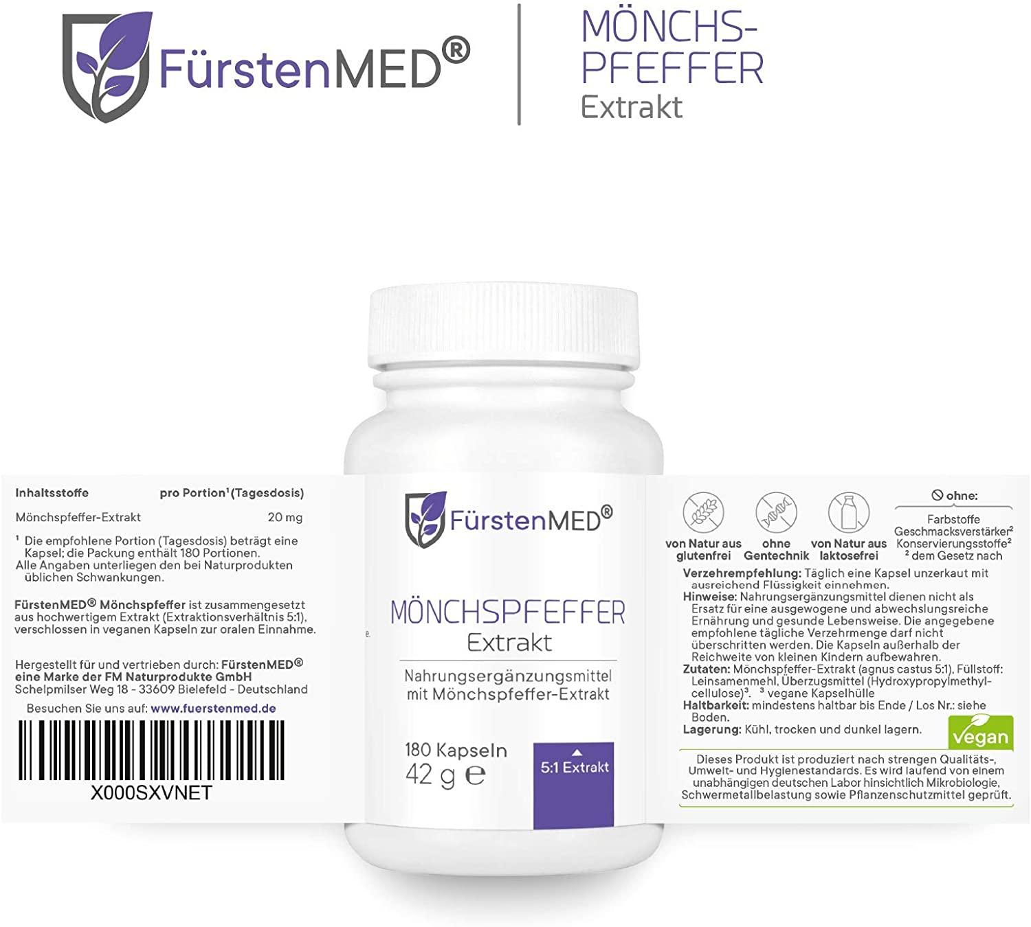 The FürstenMED® monk's pepper extract capsules with 20 mg extract (5:1) are a dietary supplement with the highest bioavailability for the body. This product is produced in Germany in compliance with the highest quality standards and hygiene guidelines. Laboratory tested and free of any additives.