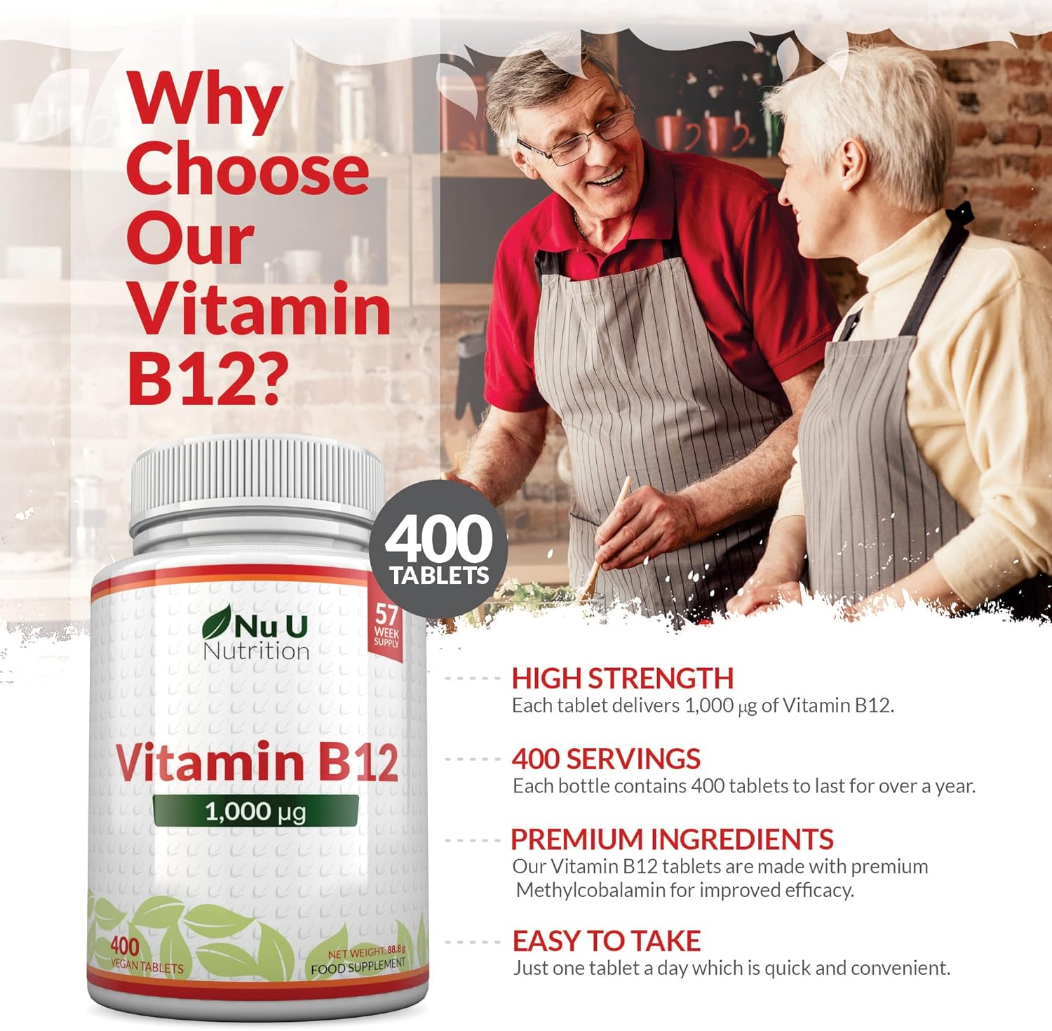 - OVER A YEAR’S SUPPLY - We offer an INCREDIBLE 400 tablets per bottle, offering unbeatable value. Just one bottle will keep you in plentiful supply of vitamin B12 for over a year. Most supplements only offer 180 tablets, meaning with our B12 you are getting 100% MORE! By purchasing our supplement you can be rest assured that you are getting one of the best quality and value for money supplements on the market.