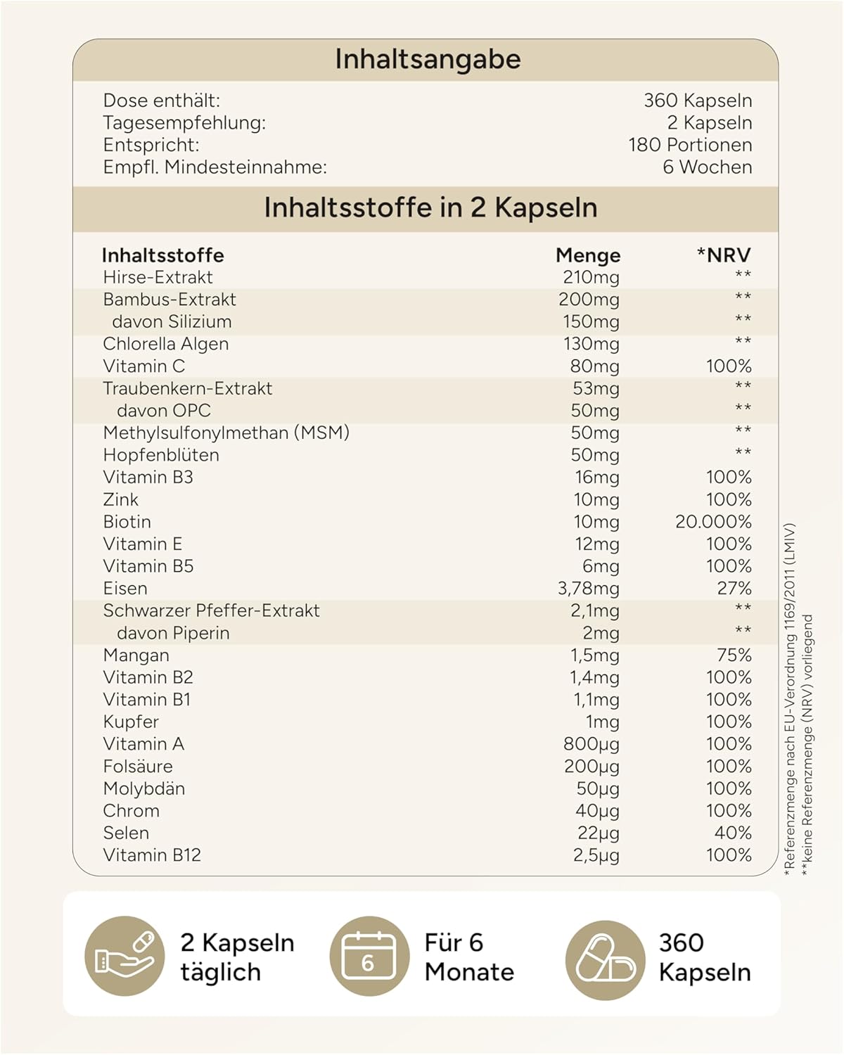 Healthy skin and hair are an expression of well-being for many people. With a balanced blend of vitamins, minerals, and plant extracts such as millet, bamboo, biotin, zinc, and silicon, this complex offers valuable support for your skin and hair.