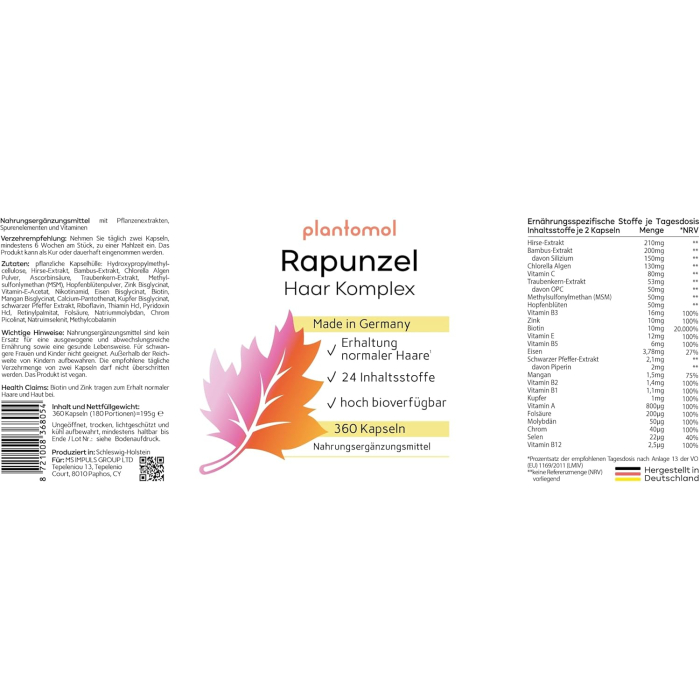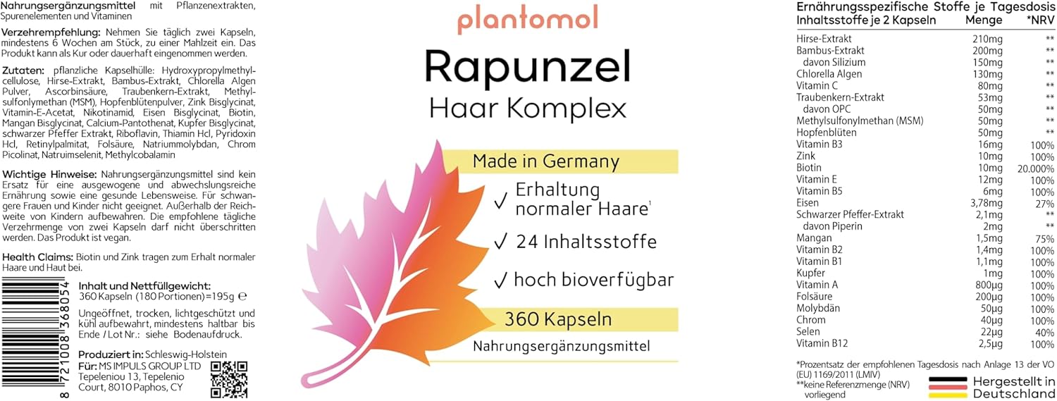 - Rapunzel - 360 hair vitamin capsules - with 24 ingredients, including millet extract silicon OPC from grape seeds + MSM and biotin high dose with 10,000 μg per day (2 capsules)