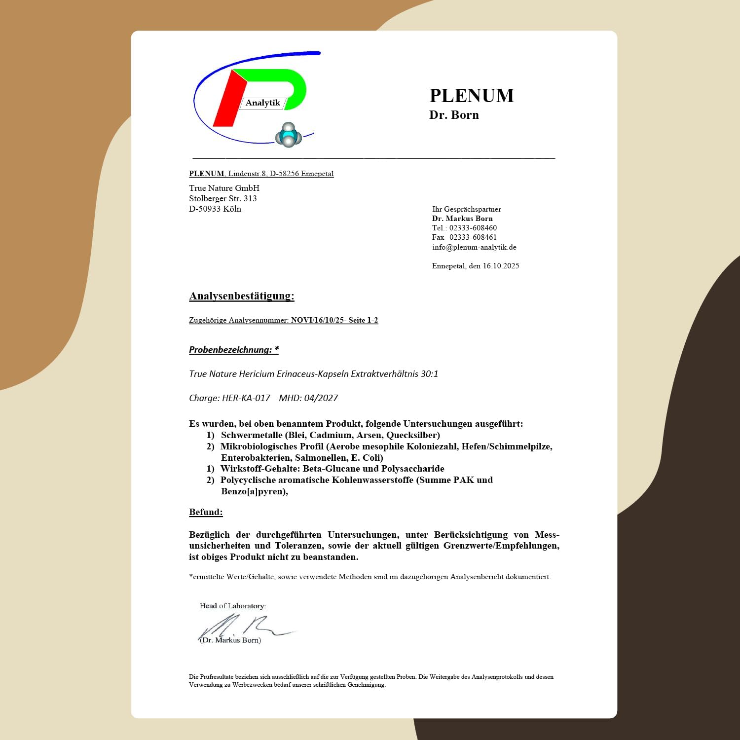 Hericium Erinaceus Fruiting Body Extract: Only the fruiting body — the most nutrient-dense, active part of the mushroom — is used for extraction to ensure maximum potency and purity. True Nature