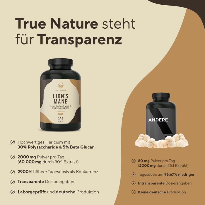 30:1 Extract Ratio: Each capsule contains 500 mg of highly concentrated Lion’s Mane extract from a 30:1 raw material conversion. True Nature