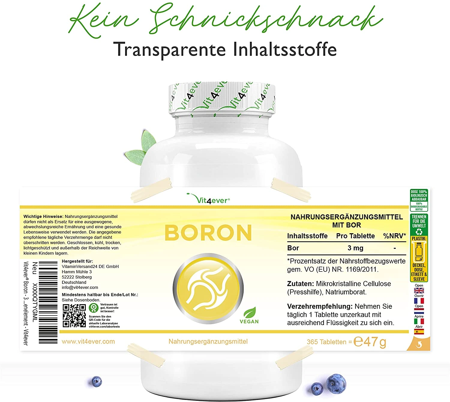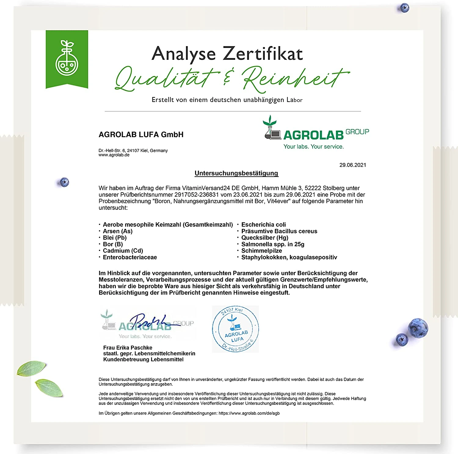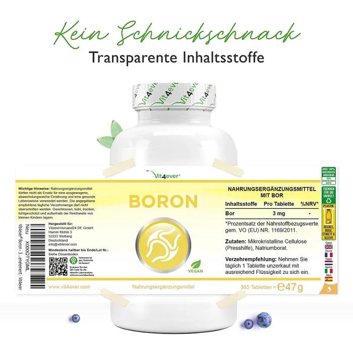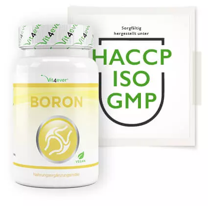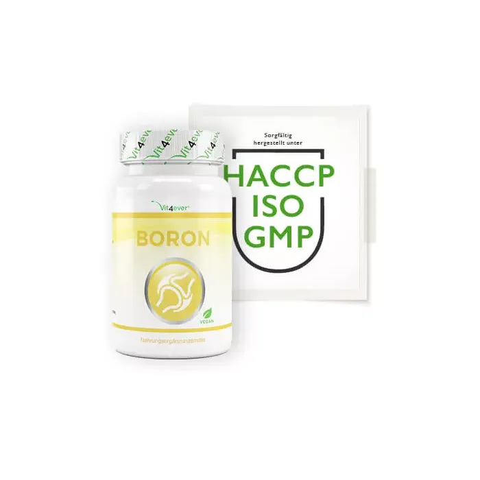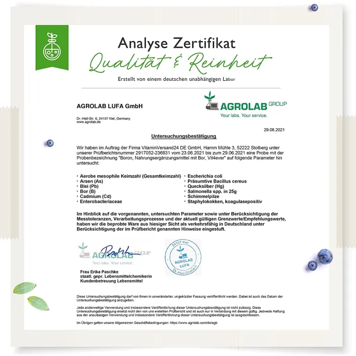В Vit4ever качество является абсолютным приоритетом, поэтому мы используем только высококачественный бор, прошедший лабораторные испытания. Наши таблетки с бором проходят независимые лабораторные испытания на содержание бора, тяжелых металлов, плесени, кишечной палочки, сальмонеллы и других соответствующих критериев тестирования. Тест проводился независимой немецкой лабораторией, сертифицированной по стандарту DIN EN ISO/IEC 17025. Сертификат анализа вы можете найти на изображениях продукта.