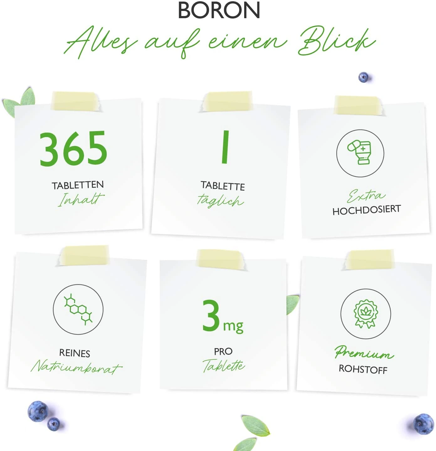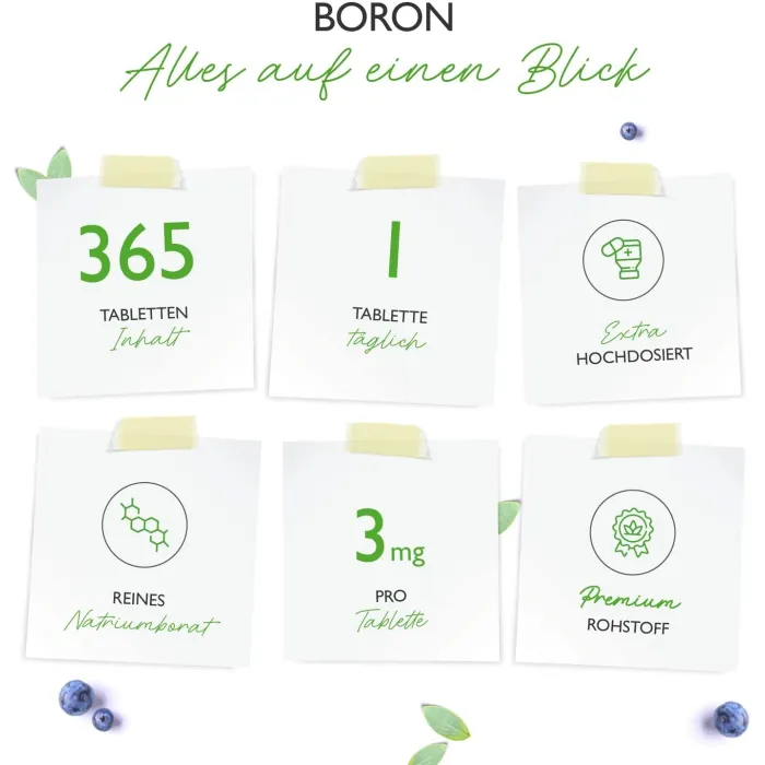 Наши таблетки с бором содержат только органический бор в форме бората натрия. Борат натрия обладает высочайшей биодоступностью и поэтому может оптимально перерабатываться нашим организмом. Каждая банка содержит 365 таблеток в практичном годовом запасе при приеме по 1 таблетке в день. Каждая таблетка содержит 3 мг элементарного бора.