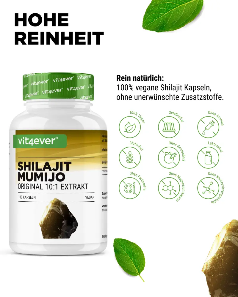 - Натуральный чистый экстракт мумиё с концентрацией 10:1, 180 веганских капсул, особенно высокая дозировка: 1500 мг экстракта мумиё мумиё на ежедневную порцию.