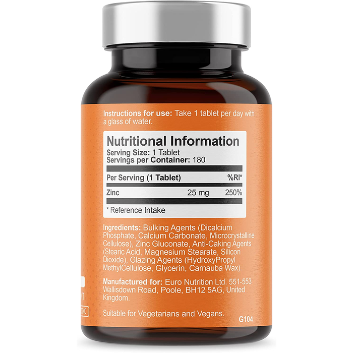 - Zinc Gluconate Source - Every tablet provides 25mg of elemental zinc (250% Reference Intake) from the zinc gluconate source