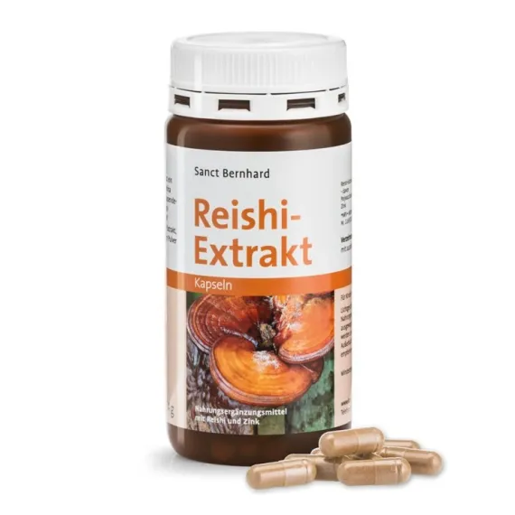 Reishi (Ganoderma lucidum), also known by the name "shiny gloss fungi" is a mushroom that mainly populates hardwoods. Its use has a tradition going back thousands of years in China and Japan. Sanct Bernhard Reishi-Extract-Capsules supplement nutrition with a 10 % polysaccharide standardised Reishi extract, which is obtained from the powder of the full Reishi mushroom in a complex process. The added zinc is one of the essential trace elements and plays an important role in a vitalised, healthy immune system as well as cell protection again oxidative stress, amongst others.