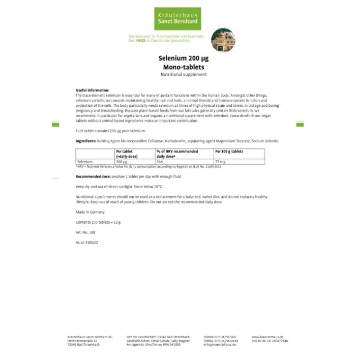 - Nutritional supplement with 200 µg pure selenium per tablet